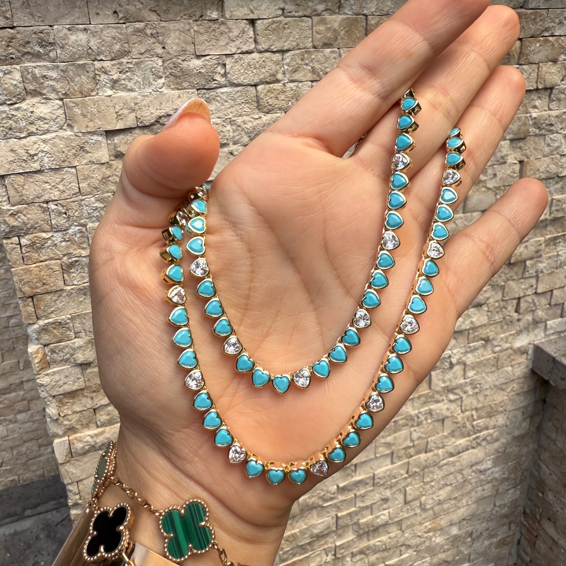 Turquoise CZ’s Bezel Heart Tennis Necklace
