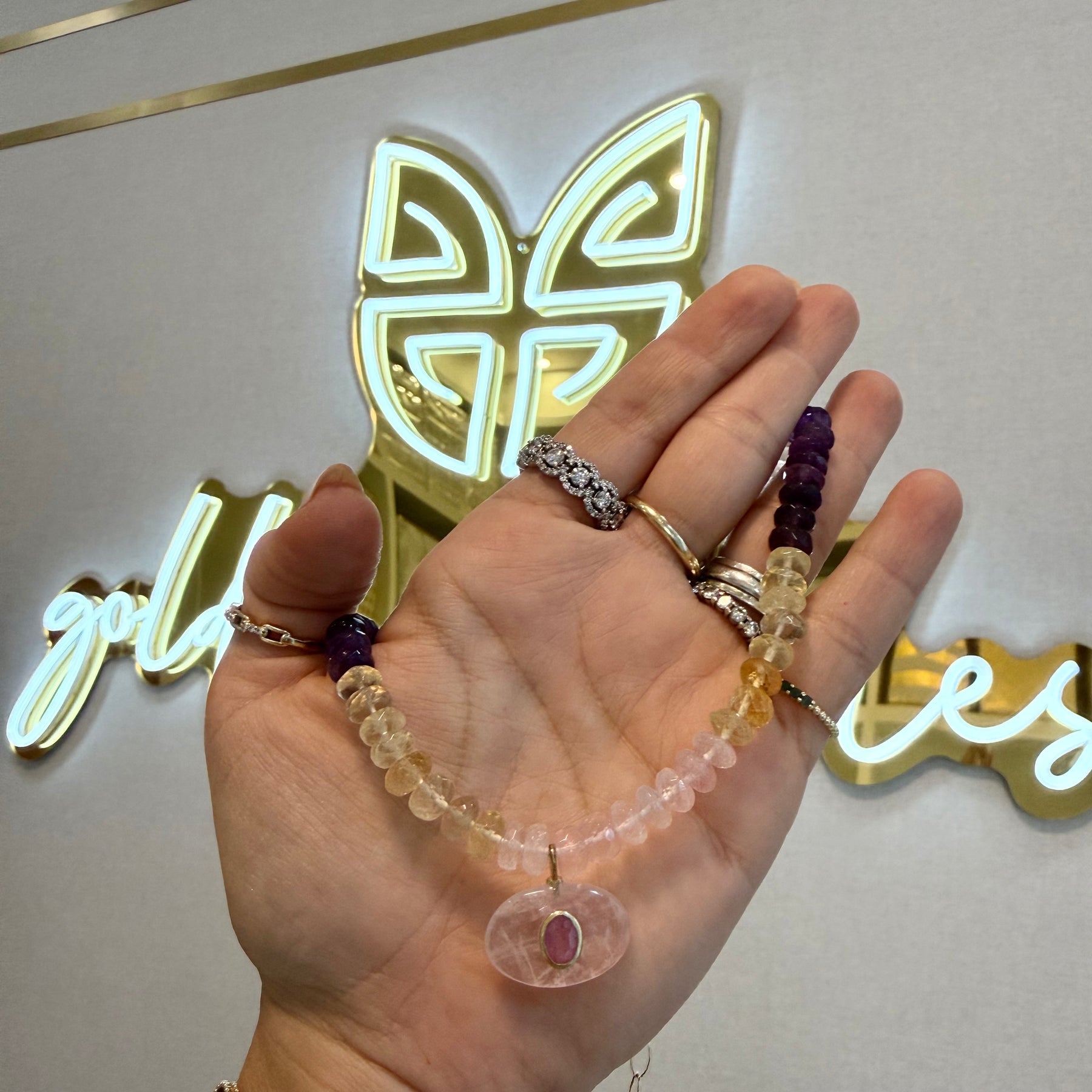 • Genuine stones (Citrine, Pink Quartz, Amethyst. Citrine radiates joy and abundance, Pink Quartz opens the heart to love and compassion, Amethyst brings calm and spiritual clarity, and Ruby ignites passion, strength, and vitality. ✨)