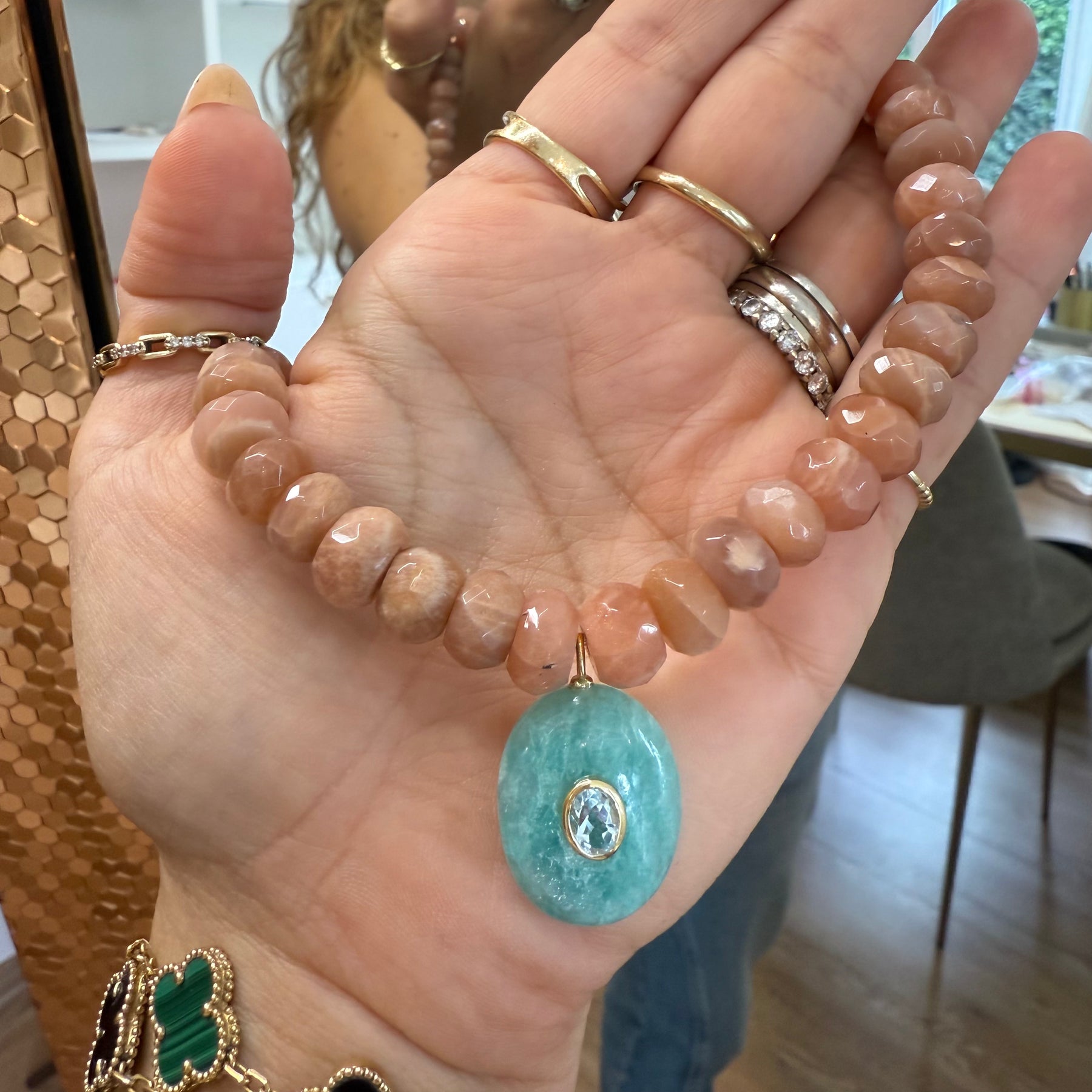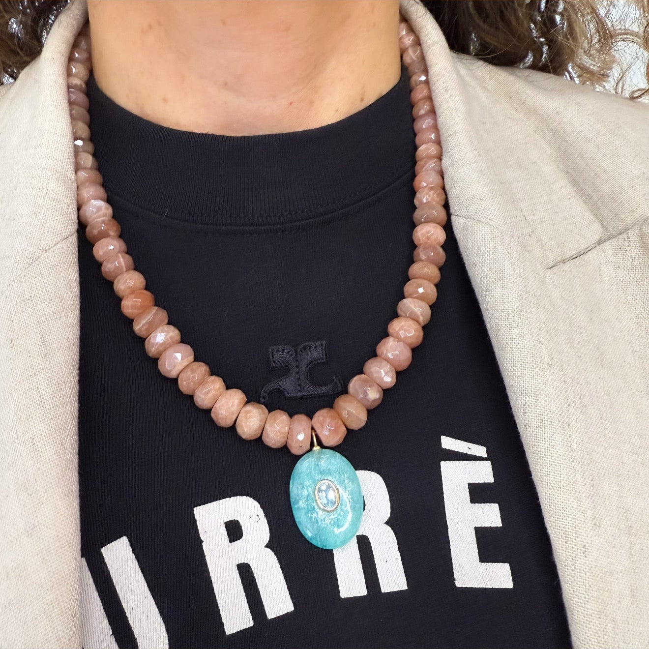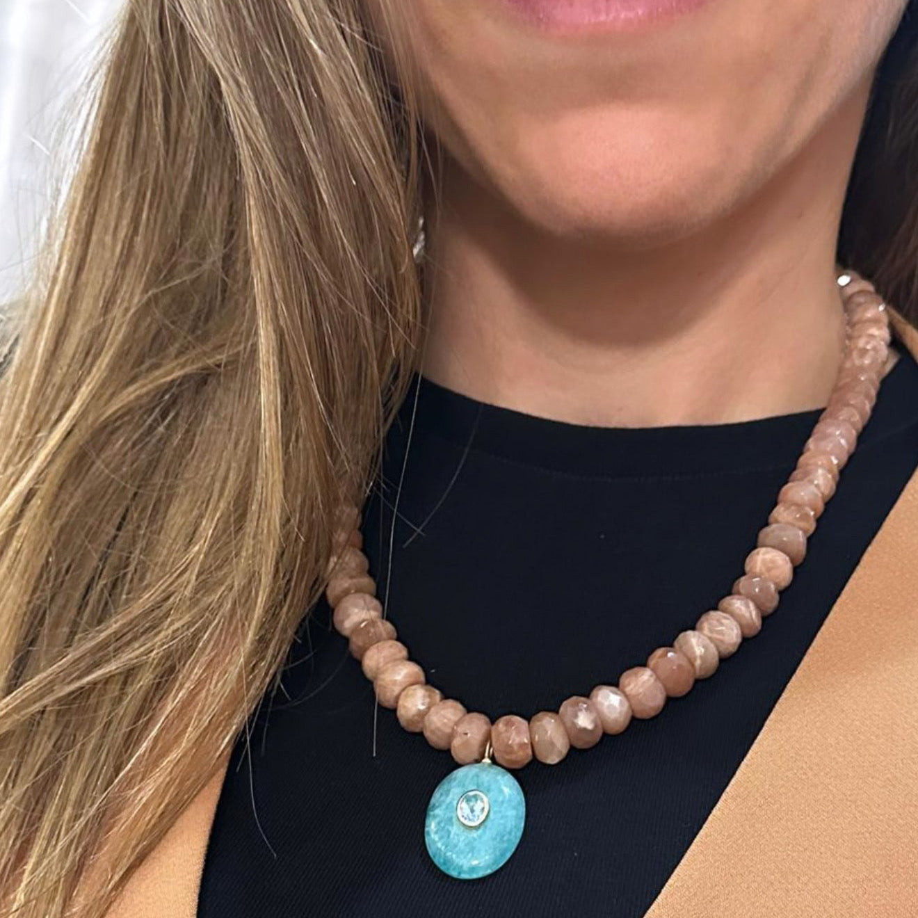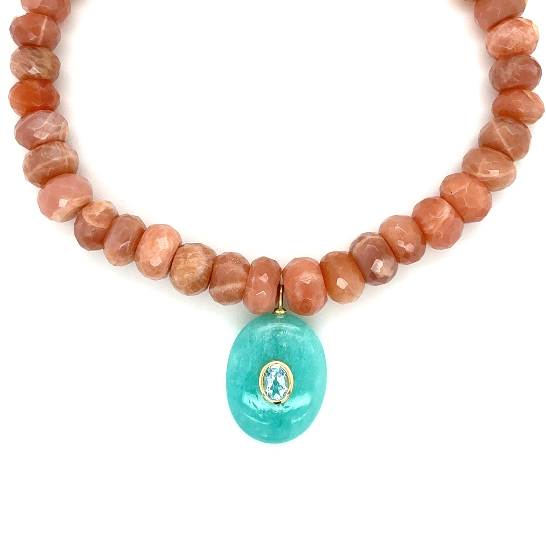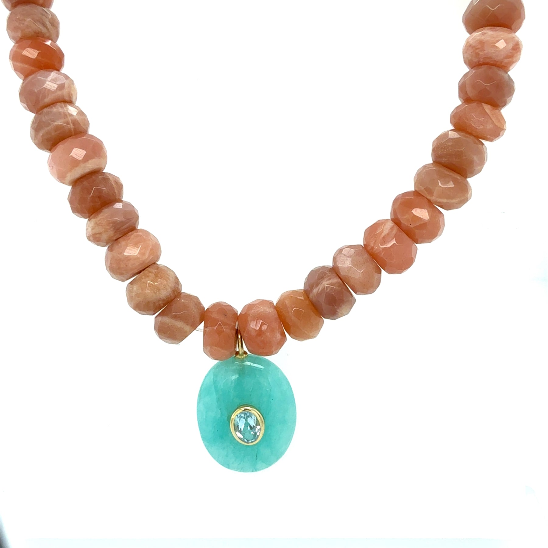 Aventurine and Blue Topaz Charm on Peach Moonstone Beaded Necklace