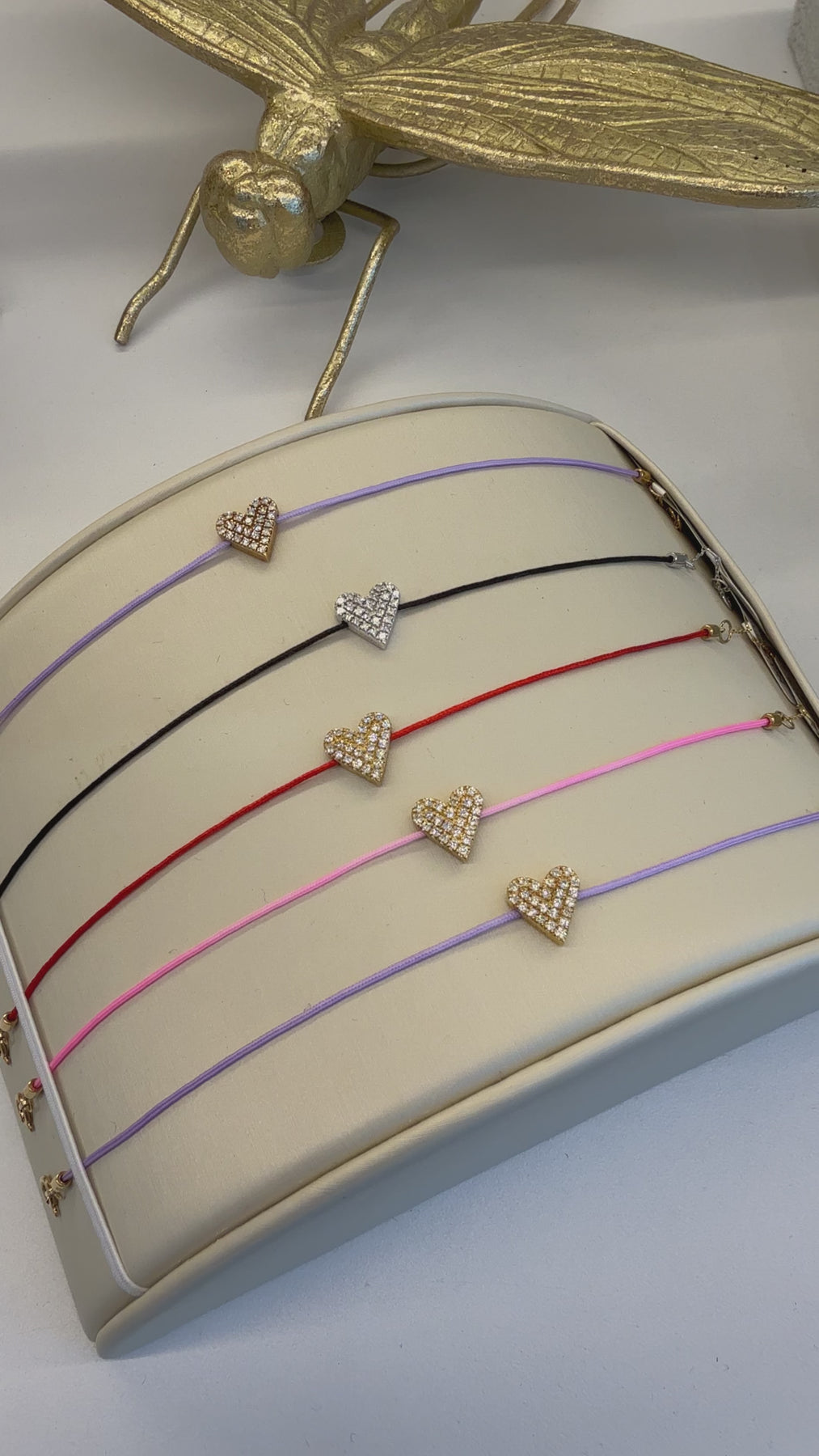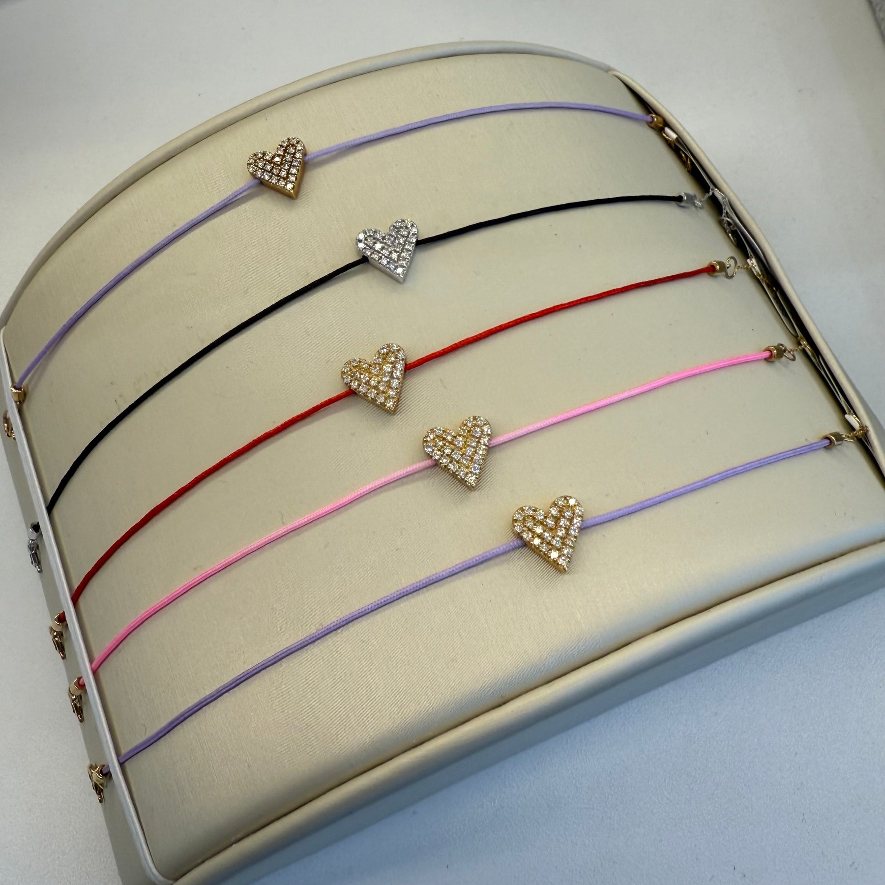 • 18k gold (heart is yellow gold in red, pink and purple cord and is white gold on black cord)