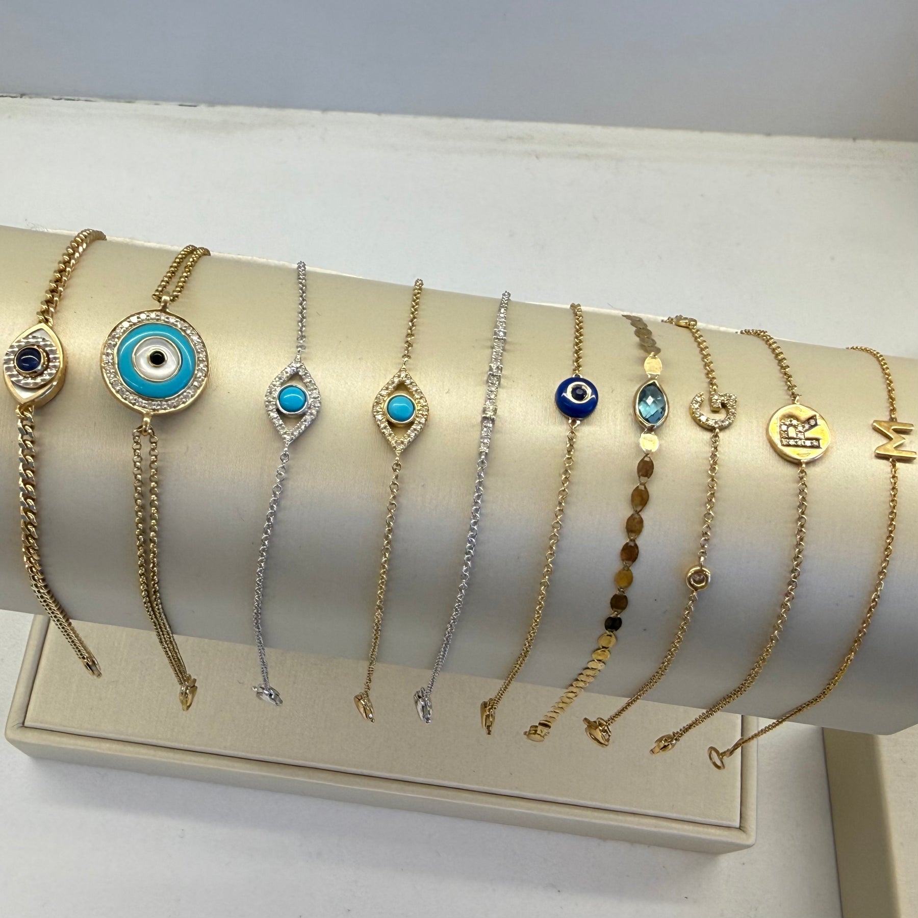 This dainty 2 in 1 evil eye bracelet is the perfect piece for everyday wear. Flip the eye and go from gemstone to diamond! Wear it by itself or stacked.