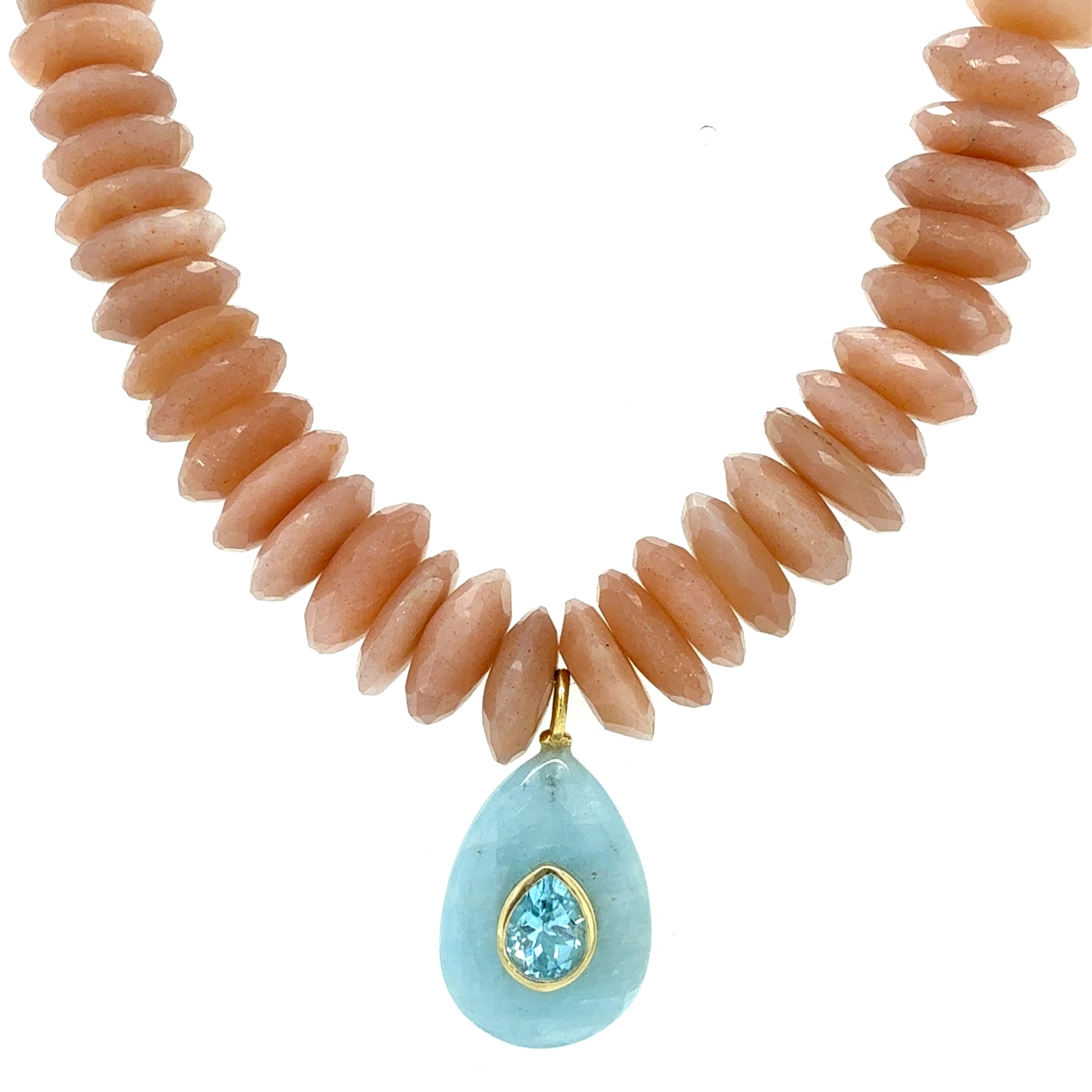 Aquamarine and Blue Topaz Charm on Peach Moonstone Beaded Necklace