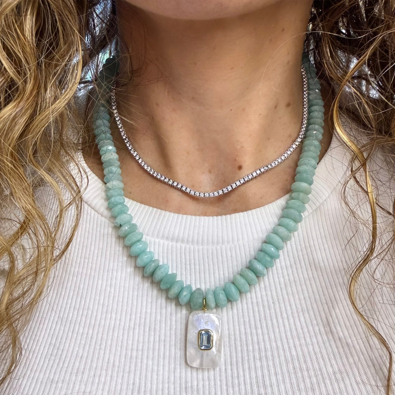 Moonstone and Blue Topaz Charm on Russian Amazonite Beaded Necklace